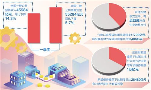 疫情对经济运行造成较大冲击,财政收入同样受到影响。一季度,全国一般公共预算收入45984亿元,同比下降14.3%。其中,中央一般公共预算收入21157亿元,同比下降16.5%;地方一般公共预算本级收入24827亿元,同比下降12.3%。