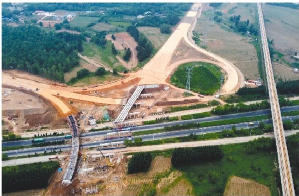 6月14日,在位于沈阳市沈北新区的沈康连接线高速公路建设项目现场,高速公路连接线的跨四环部分互通式立交已经进入桥面施工阶段,高空俯瞰,立交的引桥部分路基已初具单喇叭形状。
